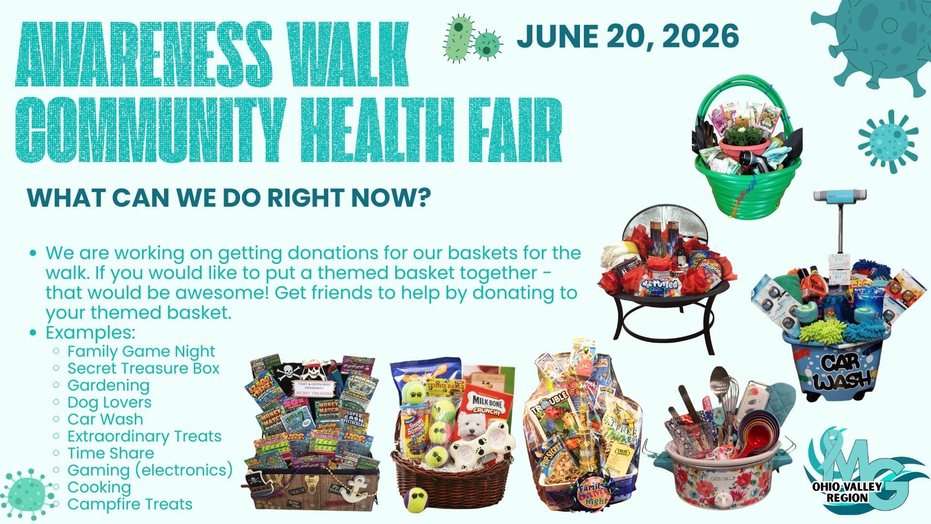 We’re inviting all members to sign up to sponsor a themed basket that will be raffled off at the MG Awareness Walk!